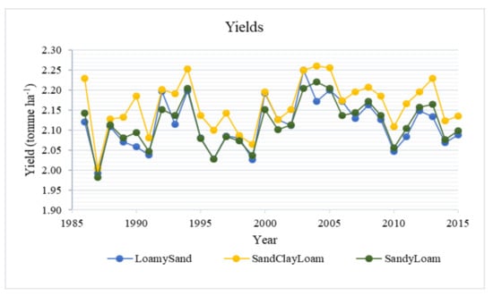 The simulations show that the farms within the basin with sandy loams, sandy clay loams and loamy sand soils have almost the same yields. This is in accordance with the assertion that maize performs best, but not similarly well, on loamy and sandy soils [2,21,36]. The low yield of maize is one of the major setbacks of maize production in Africa [6] when compared with other countries such as China, France and the United States of America where an average yield of 10–11 t/ha is usually obtained [23]. Such low maize yields of about 2 t/ha have been reported in Tanzania [37], which shows that Africa needs to improve maize production and management to achieve higher yields.