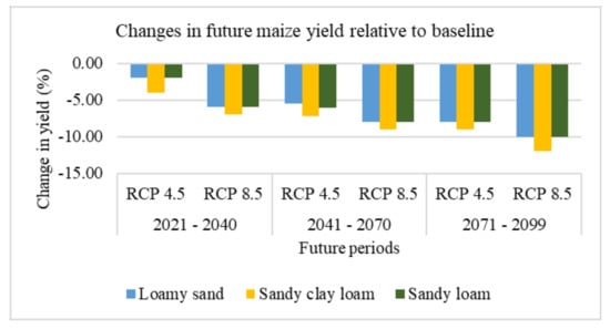 Similar to the results of this paper are the results of [37] in Tanzania which stated that the decline in maize yield will range from 3.1 to 5.3% under RCP 4.5 and RCP 8.5 while the peak decline is projected up to 9.6% in the late century under RCP 8.5 when simulated using an ensemble of climate models, even though increased CO2 concentration was not considered. Likewise, a declining trend in future maize yield was simulated in southern Africa when a process-based model (ASPIM) coupled with 17 GCMs were employed [25]. In addition, [25] argued that there are variations in maize yields based on the global climate model that was used despite a general decline trend. In the United States of America, using SALUS (System Approach to Land Use Sustainability) which is a process-based crop model coupled with an ensemble of GCMs, maize yields have also been projected to decline gradually until the late century [26].