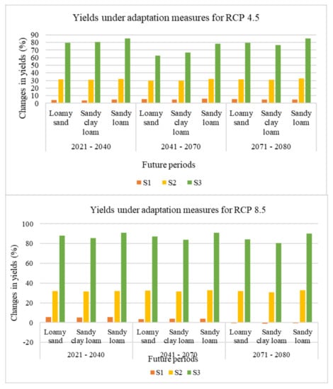 Effects of supplemental irrigation (S1), soil fertility at nitrogen value of 90 kg/ha (S2) and soil fertility at nitrogen value of 120 kg/ha (S3) on rainfed yields under RCP 4.5 and RCP 8.5.