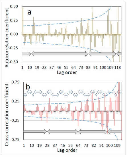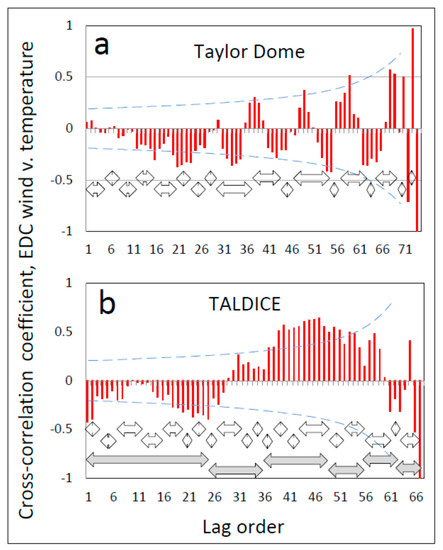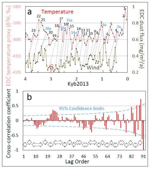Matching peaks between wind and temperature as in Figure 1a is quantitative in that it synchronizes climate events in the one record with the closest available temporal match in the other, and based on the timing of nearby well-known (“signpost”) climate events (see Section 2 and [12,13]). Quantitative corroboration is provided by progressive (“lagged”) cross-correlation of the wind and temperature records, in which the two records are aligned in time and then shifted past each other one datapoint at a time and the correlation coefficient computed at each corresponding shift (lag order). The relationship between wind and temperature is assessed quantitatively from two metrics: periodicity in the cross-correlogram at the same frequency as the correlated cycles, and statistically discernible cross-correlation coefficients in the computed correlograms (see Section 2).