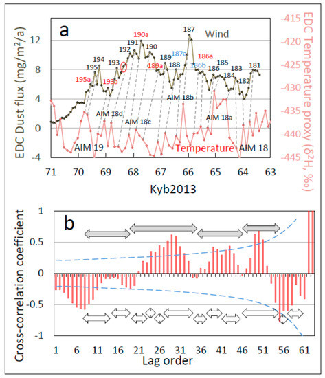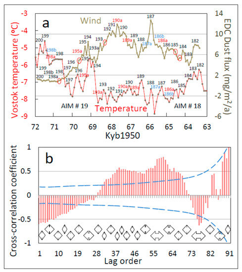 One-to-one coupling between proxies of wind at EPICA Dome C (EDC) and temperature at nearby Vostok during the last mid-glacial, 72–63 thousand years before 1950 (Kyb1950). (a) Time series showing 1:1 matching between wind peaks (brown curve) and temperature peaks (red curve) during the time of Antarctic Isotope Maxima (AIMs) 19 and 18. EDC temperature cycles are numbered following the original Vostok labeling nomenclature [12]. Additional possible AIM cycles (18a–18d, Figure 2) are not labeled in this graph. (b) Cross-correlogram between dust flux at EDC and temperature proxy at nearby Vostok for the time period 71.1–63.5 Kyb1950. The dashed blue lines in part (b) represent 95% confidence limits (positive and negative) for the value of the correlation coefficient associated with different lag orders (sample sizes).
