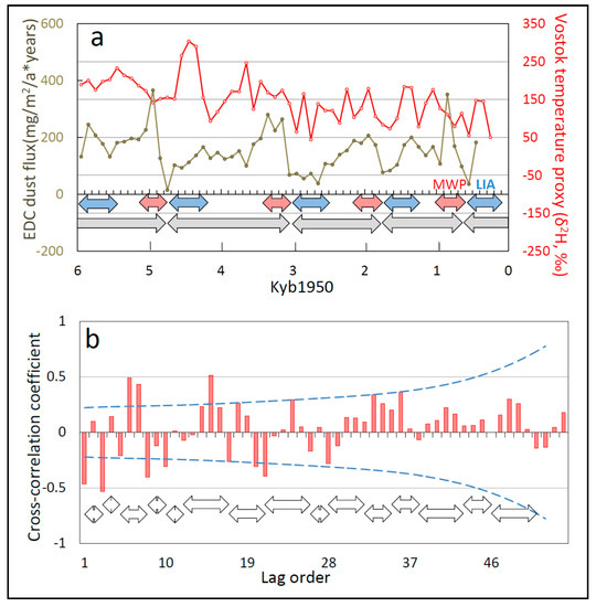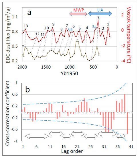 One-to-one coupling between temperature proxy oscillations at Vostok and dust flux (a wind proxy) at nearby EPICA Dome C (EDC) for the last two millennia. (a) 1:1 correspondence between wind-proxy cycles and identified temperature-proxy cycles. Wind and temperature peaks are connected by dashed lines to illustrate 100% cross-record coherence. (b) Cross-correlation between temperature proxies and dust flux over the period ~2000–397 years before 1950 (Yb1050). The dashed blue lines in part b represent 95% confidence limits (positive and negative) for the value of the correlation coefficient associated with different lag orders (sample sizes). Additional abbreviations: MWP, Medieval Warm Period; LIA, Little Ice Age.
