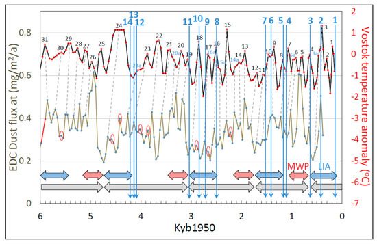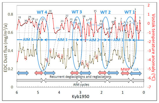 One-to-one coupling between wind proxies (dust flux) at EPICA Dome C (EDC) (lower brown curve) and temperature anomaly computed from deuterium excess at Vostok (upper red curves) over the last six millennia. Dashed lines connect wind-proxy peaks with corresponding temperature-proxy peaks, which are numbered according to the quantitative ACO/AAO cycle nomenclature developed earlier [12]. Red ovals enclose wind-proxy cycles that are unmatched in the temperature-proxy record (see text). Temperature extremes hindcasted in register with the Wind Terminus (WT) of the Antarctic Centennial Wind Oscillation (ACWO) are shown by colored bidirectional horizontal arrows (red = warm, blue = cold). The red segment of the otherwise brown wind-proxy curve at 6000–5900 years before 1950 (Yb1950) denotes a period of missing data that was filled by interpolation for visual but not analytic purposes. Additional abbreviations: AIM, Antarctic Isotope Maximum; MWP, Medieval Warm Period; LIA, Little Ice Age; WT, Wind Terminus.