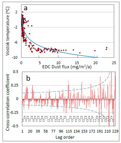 Equation (1) and the underlying empirical data imply that over low wind velocities (0–5 mg/m2/a of dust flux), peak temperature drops rapidly with increasing wind velocity. At higher wind velocities (5–25 mg/m2/a of dust flux), temperature-proxy peaks remain relatively constant in amplitude as wind velocity increases (Figure 10a). We cannot exclude the possibility that this non-linear relationship reflects, in whole or part, an artifact resulting from a non-linear relationship between wind velocity and dust flux. The cross-correlogram between wind-proxies and temperature-proxies shows tight coupling over this range (Figure 10b), with most peak correlation coefficients discernible at p < 0.05.