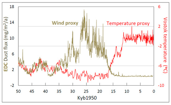 Dust-flux records analyzed here from EDC were sampled originally at high resolution, up to several dust sample datapoints per year for the most recent millennium of the Holocene declining to 1 datapoint per 10 years by 226 thousand years before 1950 (Kyb1950) [16]. Such high-resolution sampling of dust-flux record extends back in time more than 800 Kyb1950 [16]. This long and highly-resolved dust-flux record establishes the EDC paleoclimate dust-flux record as the most precise and lengthy indicator available as a proxy of Antarctic wind, supplemented by an equally long and well-resolved temperature record [24]. We averaged high-resolution dust-flux samples [16] in 40-60-year bins to estimate changes in Antarctic wind velocity. The date assigned here to each mean wind-proxy value is the midpoint of the 40-60-year bin-width over which the dust-flux proxies were averaged. Data on the timing of the beginnings and ends of past civilization are compiled at [25] based on [26,27,28,29,30], to which we added the dates of collapse of the early [31] and late [32] Persian Empires.