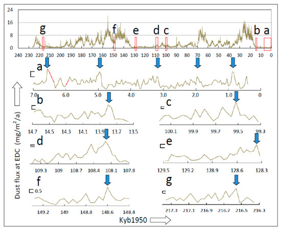 Initial matching of temperature-proxy peaks with wind-proxy peaks at EDC was done following the same procedure. Each previously-identified and numbered temperature-proxy cycle was matched with the closest nearby wind-proxy (dust flux) cycle. Over several time frames in the records analyzed, the cross-record coherence of their peaks was 1:1, i.e., matching was deterministic. In some cases, smaller peaks in the wind-proxy record were not matched with corresponding temperature peaks (<5% of all wind-proxy peaks). These few anomalous wind cycles are highlighted in all figures by enclosing them in red ovals and interpreted in terms of underlying mechanisms and forces.