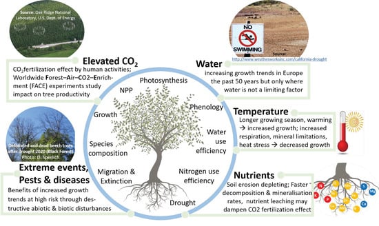 Forest productivity in Europe has generally increased over the past decades [1,2,3,4], providing that other factors were not limiting it, such as water availability, growth temperature and/or nitrogen deposition [5,6]. Heat spells combined with extended drought periods are, however, increasing worldwide and have negatively affected productivity [7], increased mortality [8,9] and induced shifts in species’ distribution ranges and species composition [10,11,12]. Temperature increase may also positively affect forest productivity, for example, due to the positive effect on photosynthesis in mountains or high latitudes, which are energy limited and not water limited [13], and also due to the lengthening of the growing season [14,15]. Besides, the continuous increase in atmospheric carbon dioxide (eCO2) acts as a fertilizer for plant growth—termed the ”CO2 fertilization effect” [16] because current CO2 levels are far from being limiting for the photosynthetic carboxylation reactions in the chloroplasts of C3 plants [17].