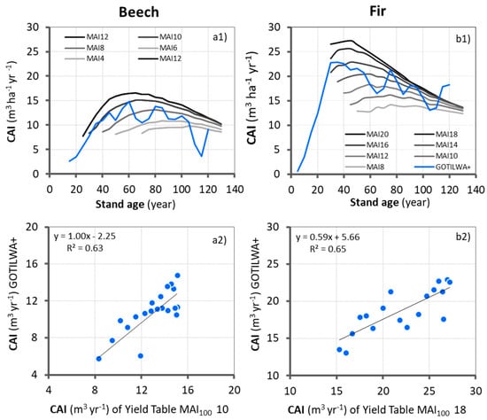 Current annual increment (CAI in m3) values for (a1, a2) beech (left panel) and (b1,b2) fir (right panel) for five productivity classes from yield tables in Baden-Württemberg until stand age 130 (grey lines; data are from permanent experimental plots, FVA, 2001) and the business-as-usual scenario assuming no climate change with GOTILWA+. Productivity classes are expressed with mean annual increment (MAI in m3 ha−1) values at stand age 100 (grey lines)—for 5 and 8 productivity classes for beech and fir, respectively. Panel (a2,b2) show the relationship (significant at p < 0.05) of CAI of GOTILWA+ with the CAI of the yield table for the productivity class MAI100 10 for beech and MAI100 18 for fir.