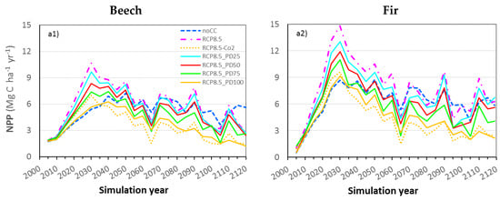 Effects of the climate change scenario RCP8.5 on net primary productivity (NPP) of beech (a1) and fir (a2) with constant CO2 concentration (370 ppm—global mean of 2000) (RCP8.5-CO2) and with increasing CO2 concentration assuming photosynthetic downregulation by 25, 50, 75 and 100% (RCP8.5_PD25, RCP8.5_PD50, RCP8.5_PD75, RCP8.5_PD100). Simulations started with a naturally regenerated juvenile stand.