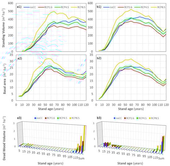 Effects of four climate scenarios (noCC, RCP2.6, RCP4.5, RCP8.5) on standing volume (1), basal area (2) and dead wood volume (3) of beech (a1–a3) and fir (b1–b3). For the noCC scenario, a climate file of 120 was generated with an in-built weather generator in GOTILWA+ using climate data of the past 40 years from a nearby meteorological weather station with constant CO2 concentration (370 ppm—global mean of 2018). For the three climate change scenarios RCP2.6, RCP4.5 and RCP8.5, changes in temperature, precipitation and CO2 were applied to the generated climate file according to the MPI-ESM-LR global circulation model.