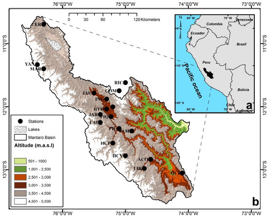 The MRB is located in the central Peruvian Andes (73°55′00″–76°40′30″ W; 10°34′30″–13°35′30″ S), with a drainage area of 34,550 km2. The basin partially covers territories of the Junín, Pasco, Huancavelica, and Ayacucho regions. The altitude of the MRB varies between 500 and 5300 masl., and its mean altitude is around 3870 masl (Figure 1). Approximately 70% of the total surface of the MRB depends on rainfed agriculture. The MRB is the primary source of farm products to several cities in Peru such as the capital city Lima [23,24].