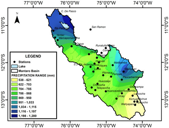 The average of the annual precipitation is lower than 1600 mm/year along the MRB, the highest accumulation of rainfall is observed over the eastern part of the basin, in the jungle of the departments of Junín and Huancavelica [20] (Figure 2). The low precipitations fall over vast spaces of the central and southern zone of MRB. The high rainfall in the northwestern and southwestern parts of MRB in the austral summer is related to orographic rainfall that is due to the transport of warm and moist winds from the Amazon basin. For the dry months (June and August) rainfall is almost negligible throughout the basin, except for the eastern region [24].