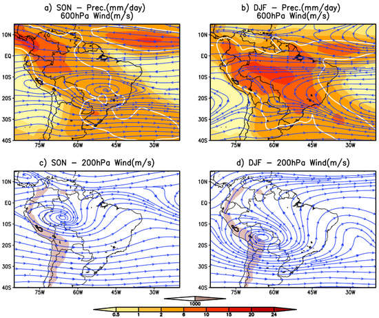 Climatology of (a,b) precipitation (mm day−1, red shading) and 600 hPa wind (m s−1, streamlines) and (c,d) 200 hPa wind (m s−1, streamlines) during (a,c) austral spring (SON) and (b,d) austral summer (DJF). White contour represents the climatological isoline of 4 mm day−1. Black contour represents the boundary of the MRB. ERA-Interim reanalysis and Global Precipitation Climatology Project (GPCP) precipitation datasets were used for the 1981–2010 period. Brown shading represents the topographic elevation above 1000 m.