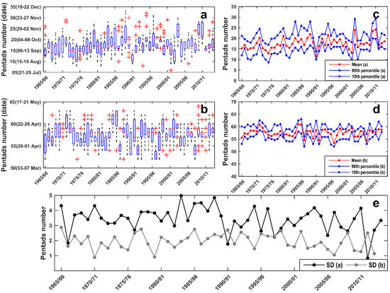 Boxplots of the (a) onset dates and (b) end dates of the rainy season. Mean, 90th and 10th percentile for (c) onset dates and (d) end dates of the rainy season. (e) Standard deviation (SD) for onset dates (a) and end dates (b) of the rainy season. Precipitation dataset (in PENs) was used for the 1965/66–2012/13 period in MRB.