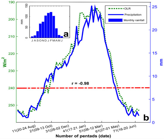 To estimate the onset and termination of the rainy season using OLR data, we consider 240 W/m2 as the threshold, this threshold agrees with previous studies [10,46,47,48]. We defined the onset of the rainy season when six consecutive PENs are lower than 240 W/m2 while the end date of the rainy season occurs when six consecutive PENs are higher than 240 W/m2.