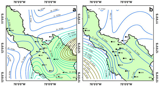 Figure 6a shows that the onset date of the rainy season begins in mid-September (14–18 September) in highland stations located over the northwestern MRB, progressing rapidly toward the center of the MRB (e.g., Mantaro valley), arriving there in the end of September (24–28 September). The propagation continues toward southwestern and southeastern MRB, arriving at the early October (29 September–3 October) and end of November (23–27 November), respectively. Figure 6b displays that the end date of the rainy season begins in the second week of April (07–11 April) over southern and central Mantaro valley, propagating rapidly in all directions toward the rest of MRB, arriving to highland stations over the central-eastern MRB in the third week of April (17–21 April) and the central-western MRB at the end of April.