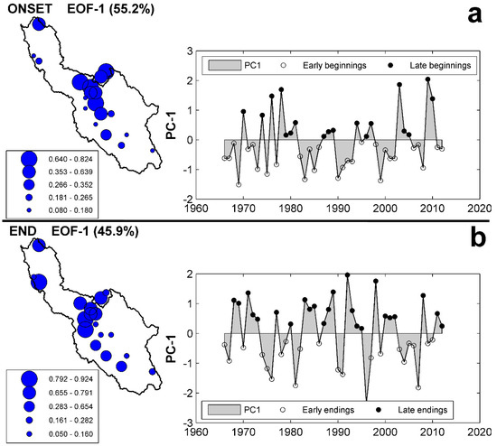 Spatial and temporal variation of the first component for (a) rainfall onset date and (b) rainfall end date of the rainy season. White dotes represent early onset and early end dates. Black dotes represents late begin and late end dates. Analysis for the 1966–2013 period.