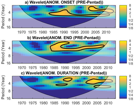 Wavelet analysis for time series of (a) onset, (b) end, and (c) duration of the rainy season over MRB for the 1963–2013 period. The black line is the 5% significance level using the red noise model, and the thin black line indicates the zone of influence.