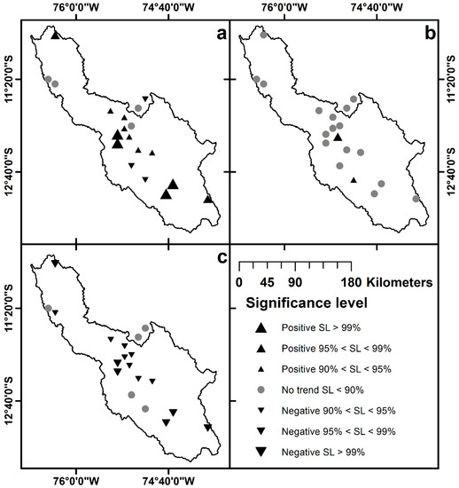 There is a predominance of positive trends of the onset dates over the northeastern, central and southern part of MRB (12 out of 19 stations) for the period 1965–2013 (Figure 9a). However, Figure 9a also shows a negative trend over the southwestern part and the eastern boundary of the central part of MRB. While the non-significant trend partially prevails over the central and northwestern MRB. These results show that negative and insignificant trends prevail in the highland stations (>4500 masl.). However, the end dates of the rainy season do not present a significative tendency, except for two stations that show positive trends (Figure 9b). Analogously, the duration of the rainy season over MRB presents a negative trend in the same stations as in Figure 9a, except for five highland stations (Figure 9c). It evidences a reduction of the duration of the rainy season over MRB.