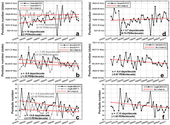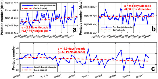 For a more extended period 1974/75–2012/13 at 2.5° OLR resolution (Figure 11d–f), there is a delay in the rainfall onset of 3.7 days/decade (Figure 11d). The end dates decrease in 4.4 days/decade (Figure 11e). The duration of the rainy period shortens in 7.15 days/decade (Figure 11f). The end and duration trends show significance at 90% of the confidence level. Thus, we confirm that the OLR dataset only gives us a rough approximation as to the onset and end dates of rainy seasons, as [10,47] also indicated. All these results evidence a delay of the onset date, also the duration of the rainy season tends to shorten.
