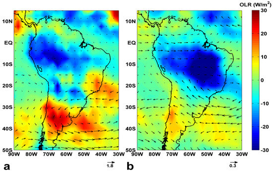 Composites of 600 hPa winds (m/s) and OLR (W/m2) for the difference of four PENs after minus four previous PENs of the onset of the rainy season in MRB. (a) Early beginnings years and (b) late beginnings years of the rain season. Analysis based on ERA-Interim reanalysis. The OLR data set has a 2.5° latitude-longitude resolution.