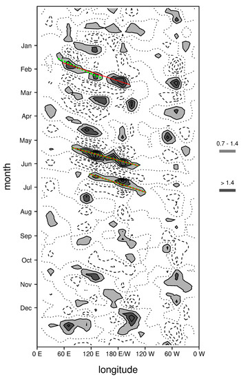Illustration of the compositing method. Band pass (15–75 days) filtered rainfall for 15 S to 15 N is contoured with a 0.7 mm/day contour interval. The zero contour is dotted, and values greater than 0.7 (1.4) mm/day are shaded light (dark) gray. Dotted green lines indicate potential MJOs identified by an objective algorthm; red lines shows paths of MJOs included in the composite.