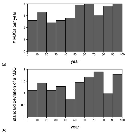 The LCM typically produces several MJOs per year (Figure 4a), consistent with what [6] observed in nature using a similar MJO compositing approach. The frequency of MJO occurrence generally increases during the coarse of the simulation. During the first half of the simulation there are an average of 2.74 MJOs per year, and during the second half of the simulation there are an average of 3.74 MJOs per year (Figure 4a). The standard deviation in the average annual MJO count for each decade is also generally higher later in the simulation, increasing from an average of 1.13 in the first half of the simulation to an average of 1.56 in the second half of the simulation (Figure 4b). This suggests that not only does the MJO become more frequent with time, but there is also greater variability in the number of MJOs from one year to the next after the radiative forcing is modified. During the two decades of finer-resolution model spin-up that precede the results shown in Figure 4, average annual MJO counts are 2.5 and 1.8 respectively and decadal standard deviations in MJO counts are 1.4 and 1.1 respectively, which are consistent with the general patterns shown in Figure 4.