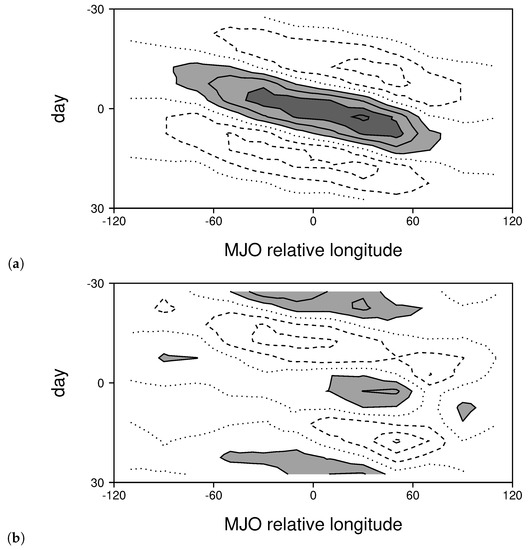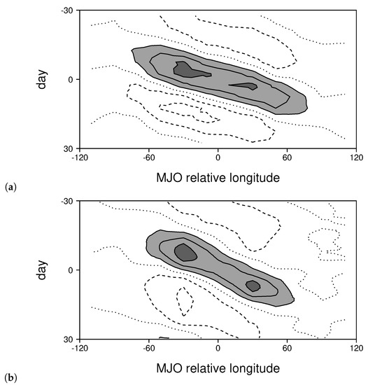 The composite MJO rainfall time series for the last 30 years of the simulation shows more intense rainfall, a larger convective envelope, and a broader longitude range covered by MJO rainfall anomalies (compare Figure 9a and Figure 5a). The eastward-propagating dry anomalies that precede and trail the convective envelope are also larger and more intense. These changes, along with a decrease in period, are also evident in the difference field between the two rainfall time series (Figure 9b). The rainfall also becomes more intense later in the convective life cycle (Figure 9a,b). Finally, we note that the difference field shows stronger positive rainfall anomalies 25–30 days prior to and after the main convective envelope, suggesting that MJOs have more of a tendency to occur in series later in the simulation [42].