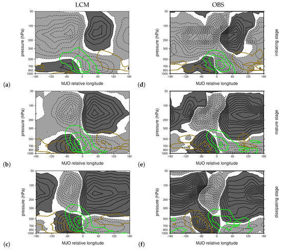 Figure 6 compares the simulated and observed composite vertical structures of MJO zonal wind and moisture perturbations. In this figure the simulated fields are shown on the left, and the observed fields are shown on the right. The first row is for the initiating stage, the second row for the mature stage, and the third row for the dissipating stage. Scanning this figure for light and dark gray shading reveals that the LCM reproduces the observed evolution of the vertical structure of zonal wind. Initially, upper-level flow is predominantly easterly (light gray shading) with a narrow band of westerlies centered about 60 degrees east of the MJO convective center which is located at longitude 0 (dark shading; Figure 6a,d). Over time, upper-level winds transition to become primarily westerly with a narrow band of easterlies just to the west of the convective center (Figure 6c,f). At low levels, there is a broad region of westerlies to the west of the convective center in the initiating stage (Figure 6a,d) that deepens and becomes more narrow later in the MJO’s life cycle in both the simulated and observed composite (Figure 6c,f). Low-level easterlies to the east of the convective center are initially narrow (Figure 6a,d), but span a broader longitude range over time in both the simulated and observed composite (Figure 6c,f). Throughout the convective life cycle there are strong low-level mosture perturbations (green contours) near the convective center that are shallower (deeper) to the east (west). Dry perturbations (gold contours in Figure 6) are initially stronger and deeper on the east side of the convective center, but later there are deep and intense dry perturbations centered just to the west of the strongest low-level westerlies (Figure 6c,f).