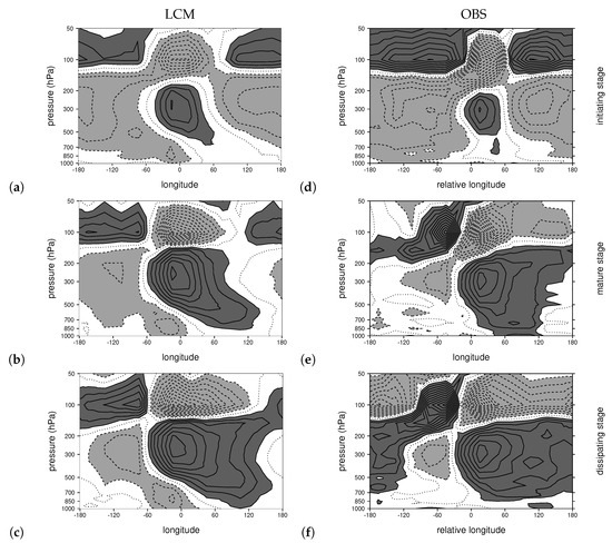 The LCM also reproduces the observed evolution of temperature perturbations (Figure 7). During the initiating stage most of the equatorial troposphere is cool, except for an upper-level warm perturbation near the MJO’s convective center (Figure 7a,d). In both the LCM and in nature the warm perturbation then spreads eastward and becomes deeper over time (Figure 7b,c,e,f). The warm perturbation spreads over a greater longitude range in nature, which could be a result of the longer period of the observed MJO (e.g., see the discussion in [6] about the warm Kelvin wave that grows eastward out of the MJO’s convective heating). By the dissipating stage most of the troposphere is relatively warm expect for a small region to the west of the MJO’s convective center (Figure 7c,f). Temperature perturbations in the lower stratosphere are generally out of phase with upper-tropospheric temperature perturbations throughout the MJO’s convective life cycle (Figure 7).