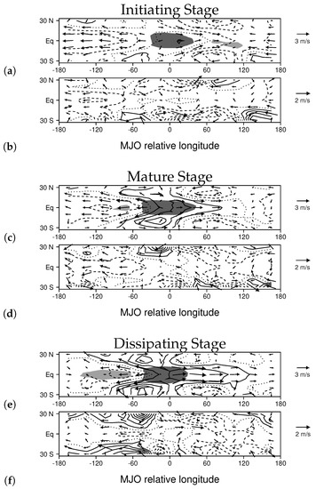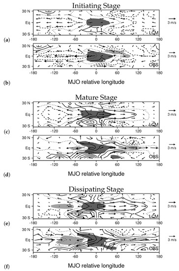 The interplay between equatorial Kelvin waves and Rossby waves in the LCM is also similar to that in nature. Figure 8 shows the horizontal structure of mean tropospheric temperature (contours) and the upper-level flow field for each stage of the MJO. In both the LCM and in nature, during the initiating stage there is a negative phase equatorial Kelvin wave spanning about half way around the world to the west of the MJO’s convective center, which includes negative temperature perturbations and easterly upper-level flow in a narrow equatorial band (Figure 8a,b). Upward motion on the leading edge of this wave likely helps to initiate MJO convection. Over time Rossby gyres form to the west of the convective center, and a warm phase Kelvin wave grows out of the east side of the convective center (Figure 8c–f).