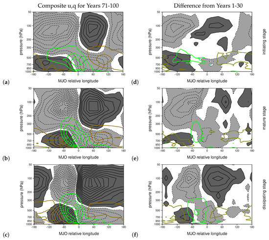 The change in MJO zonal wind and moisture perturbations during the course of the simulation. (a–c) Year 71–100 composite MJO zonal wind and moisture perturbations for the initiating, mature, and dissipating stages respectively. (d–f) The difference between Year 71–100 moisture and temperature perturbations and those for Years 1–30 for the initiating, mature, and dissipating stages respectively. Zonal wind and moisture perturbations are contoured as in Figure 6.