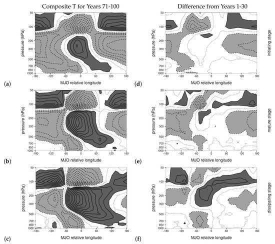The change in MJO temperature perturbations during the course of the simulation. (a–c) Year 71–100 composite MJO temperature perturbations for the initiating, mature, and dissipating stages respectively. (d–f) The difference between Year 71–100 temperature perturbations and those for Years 1–30 for the initiating, mature, and dissipating stages respectively. Contoured as in Figure 7.