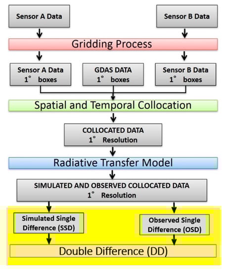 A robust inter-satellite calibration algorithm developed by Central Florida Remote Sensing Lab (CFRSL) has been applied to multiple microwave radiometers. It compares two satellite radiometer observations, on a channel basis, for homogeneous earth scenes that are collocated spatially and temporally. In the simplest sense, if the corresponding channels of two radiometers, with identical design, were to make an observation over the earth at the exact same time and space, the difference in their Tbs should reflect the radiometric calibration bias between the instruments. Unfortunately, for radiometers of different designs, the situation is more complicated due to different center frequencies, bandwidths and/or earth incidence angles; thus, normalization between the instruments is required before cross-calibration. Using the CFRSL XCAL algorithm, this normalization utilizes microwave radiative transfer theory to translate the measurement of an instrument to a common basis before comparison. This algorithm involves three procedures to obtain simulated Tbs, namely, gridding, collocation and radiative transfer model simulation. The double difference technique is then applied to the observed and simulated Tbs, to obtain the calibration biases. A block diagram of these procedures is presented in Figure 1, and more details can be found in Biswas et al. [18].