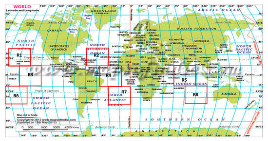 In order to investigate the uncertainty variation of the geophysical parameters associated with geophysical location, eight different oceanic regions were selected within latitudes [45° S, 45° N] and longitudes [180° W, 180° E] (Figure 3). The atmospheric parameters fed into the Monte Carlo simulation included atmospheric temperature profiles and water vapor profiles stored in 21 pressure levels in GDAS, and the surface parameters consisted of SST and wind speed. Based on the mean bias and root mean square (rms) of these parameters for five geographic regions documented by Smith et al in their Table 2 [22], we have extended the analysis to the eight regions shown in Figure 3, by mapping additional three regions out of its original five ones. The bias and rms values of these geophysical parameters over the eight regions are listed in Table 3. In each iteration of the Monte Carlo simulation, a random sample (grid) is selected and 10,000 sets of Gaussian distributed noises with predetermined mean and rms were randomly generated and correspondingly added to the four environmental parameters. These perturbed geophysical fields were then used as inputs to the RTM to simulate theoretical Tbs for the subsequent calibration biases. This Monte Carlo simulation was run for a sufficiently large number of iterations that was greater than the minimum sample size (1300 iterations in this case).