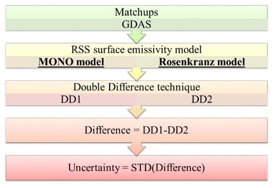 Diagram of uncertainty estimation procedure for the discrepancy in two different atmospheric absorption models: Rosenkranz and Mono.
