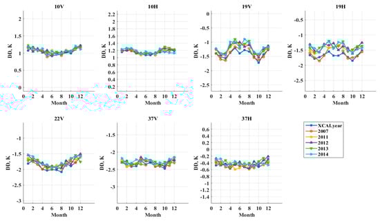 The CFRSL XCAL algorithm was first applied to TMI/GMI to derive the Tb biases listed in Table 7. Next, TMI was intercalibrated relative to WindSat for 6 periods of one-year duration, spanning in total more than 8 years (July 2005 to December 2014). During this time span, the average biases of TMI/WindSat (Table 7) are exceptionally consistent (< 0.1 K) for all channels except for the water vapor channels at 19 GHz and 23 GHz. For these channels, it is noted that the first two years are similar, but a step function change (maximum ~ 0.2 K) occurred at the third year, and this was stable for years 3–6. It is suspected that this is the result of changes in the GDAS NWP model that occurred during this period. Finally, WindSat/GMI intercalibration was performed and the corresponding Tb biases are also given in Table 7.