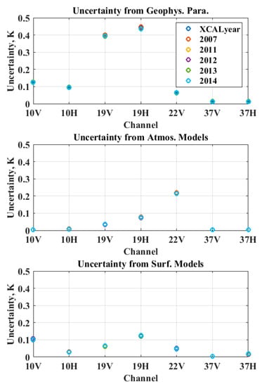 To evaluate this, the CFRSL XCAL algorithm was performed iteratively with different spatial and temporal resolutions, and the standard uncertainty of the sampling process was then calculated based upon the multiple sets of calibration biases. Specifically, eight cases of different temporal resolutions were studied in a time window of 15 min. Therefore, Case 1 was the XCAL of TMI and GMI when their observation time difference was 0–15 min, and the next one was 15–30 min, and so on. The five cases of spatial resolutions with different latitude/longitude box sizes were 1° × 1°, 0.75° × 0.75°, 0.5° × 0.5°, 0.375° × 0.375° and 0.25° × 0.25°, respectively. The highest spatial resolution was equivalent to the GMI instantaneous field of view (IFOV) at 10 GHz (19 ×32 km). Eight sets of mean values and std values of Tb biases were then obtained for temporal sampling variations, and five sets for spatial sampling variations. Using the treatment of the Type B method (Equation (2)), the spatial and temporal standard uncertainties per channel were calculated and listed in Table 2, where the largest value is only 0.018 K in 37 GHz H-pol channel. Given such small values of uncertainties and the considerably large computation resources consumed, we concluded that the impact of resolution variation is insignificant and can be ignored in future uncertainty quantification applications.