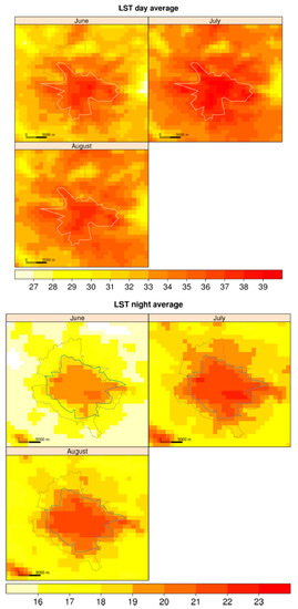 The Moderate-Resolution Imaging Spectro-Radiometer (MODIS) instruments aboard NASA Terra/Aqua satellites have become a popular tool for urban climate studies due to a few major advantages: (1) spatial and temporal resolutions (1-km and 4 images daily) appropriate for urban climate applications; (2) significant time span, suitable for climatology, as the monitoring has been regularly performed since 2000 (Terra) and 2002 (Aqua). LST is a key parameter in the estimation of urban heat fluxes and highlighting the presence and magnitude of UHI (Figure 1) and heat health risk [67,68] and has been widely used in climatological studies at urban scale (e.g., [69,70,71,72,73,74,75]).