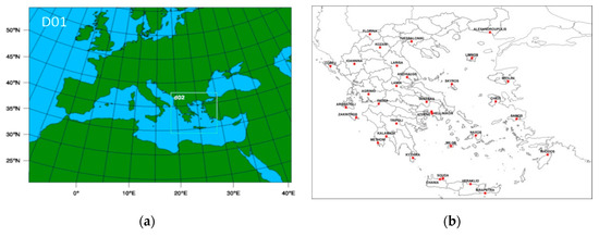 (a) Weather Research and Forecasting (WRF) model domains: D01 coarse domain with 20-km, the innermost D02 domain covering the Greece. (b) Location of the selected observational stations of the Hellenic National Meteorological Service (HNMS).