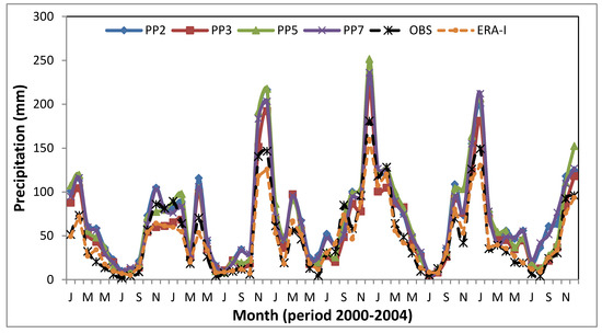 Observed and simulated mean monthly cumulative precipitation values on the total grid stations’ points, for the four different simulations (PP2, PP3, PP5, PP7), for the high resolution domain of Greece during 2000–2004.