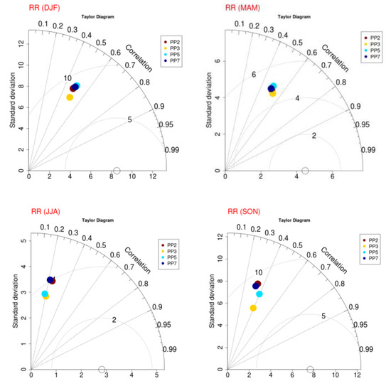 Seasonal Taylor diagrams of the four WRF simulations (PP2, PP3, PP5, PP7) with respect to observed daily precipitation (RR) for the high-resolution domain of Greece (D02).