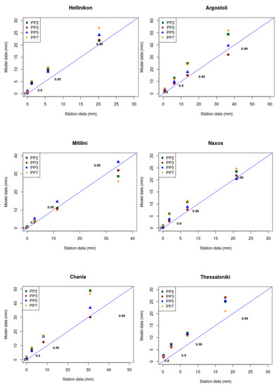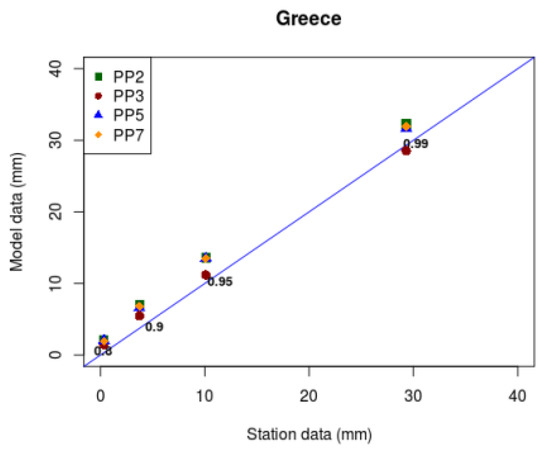 In general, regional models still misrepresent daily precipitation and precipitation extremes because of resolution or/and parameterization deficiencies [3]. The precipitation analysis was extended on studying the intensity of daily precipitation; thus, the 80th, 90th, 95th and 99th higher ranking percentiles were calculated. This analysis is very important for climate change assessment related to extreme weather events, drought and flooding events, that have significant socioeconomic impacts on the global community. The results are shown in Figure 5, where the WRF percentiles distribution is plotted versus the observational data for the domain of Greece and several indicative stations distributed all over Greece during these 5 years. The straight (blue) line depicts a perfect performance, indicating the over- or under-estimation of the simulated values compared to the observations.