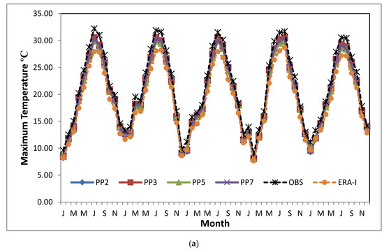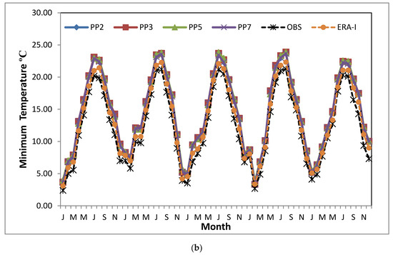 Monthly precipitation time-series are illustrated in Figure 2. The seasonal pattern of monthly precipitation is well captured by the majority of the schemes, also observed in the study of García-Díez et al. [57], remarking the highest precipitation during winter and lowest during summer. The black, dashed line illustrates the seasonal variability of monthly precipitation derived from the average values of the available stations, which is noticed on the models results. There are obvious similarities in the precipitation patterns among all experiments and observed data for the 5 years of comparison, yielding smoothly the precipitation’s inter-annual variability, especially during the wettest months and summer periods characterized of limited rainfall. Some differences show that in general, there is an overestimation of precipitation compared to ground data for all setups, and this probably is caused by excessive wintertime precipitation [85]. On the other hand, ERA-Interim appears to underestimate winter precipitation from November to January. Some cases of precipitation’s underestimation are related to the PP3 setup during the study period, and as this simulation appears to have the less overestimation among setups.