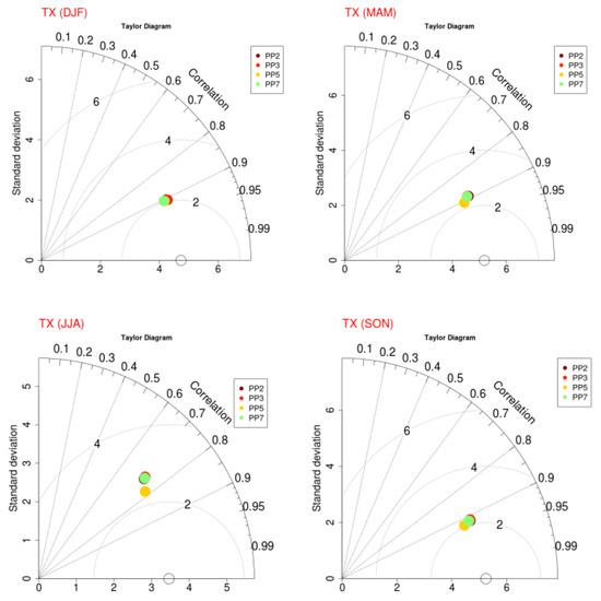In addition, Taylor diagrams were used to provide a comprehensive statistical and graphical assessment of how well the simulated and observed values compare with each other in terms of their correlation and normalized standard deviation, depending on the choice of the physical parameterizations [77]. Taylor diagrams and statistical metrics were calculated for seasonal and yearly time periods for the examined variables of daily maximum temperature (TX) maximum temperature (TX) and precipitation (PR). The white circle represents the standard deviation of the observational data. The formula of the calculated statistical metrics is given in Table 2: