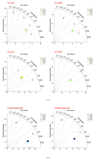 (a)Seasonal Taylor diagrams of the four WRF simulations (PP2, PP3, PP5, PP7) with respect to observed daily maximum (TX) and minimum temperatures (TN) for the high-resolution domain of Greece (D02). (b) Annual Taylor diagrams of the four WRF simulations (PP2, PP3, PP5, PP7) with respect to observed daily maximum (TX) and minimum temperatures (TN) for the high-resolution domain of Greece (D02).