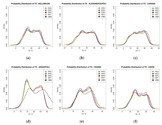 In a few stations, a lower model observations correspondence is found. More specifically, the Argostoli, Corfu, Florina, Heraklion, Kithira, Methoni, Milos and Mitilini stations illustrate a large shift towards colder values in the medium temperature range with higher density values. In Chania station all simulations appear to have higher density values for hotter temperatures, while in Ierapetra, the opposite behavior is observed. On the other hand, the TN probability distributions of WRF simulations (not shown), appear to have a large shift towards hotter values in the temperature range corresponding to either higher or lower density. This behavior justifies the consistent model’s overestimation, especially during the summer period.