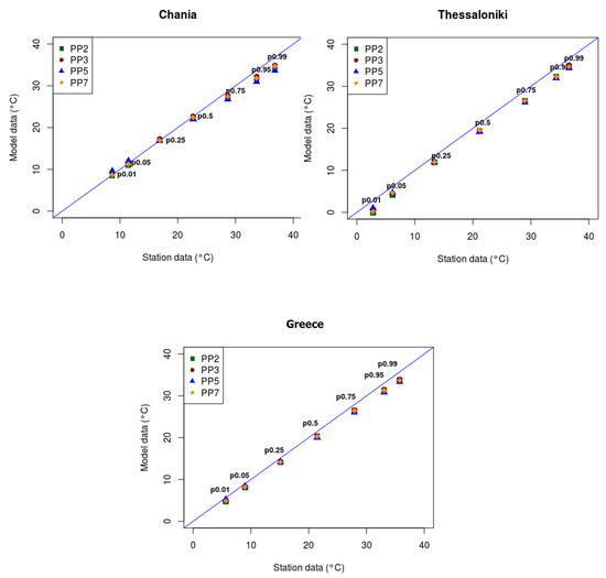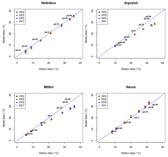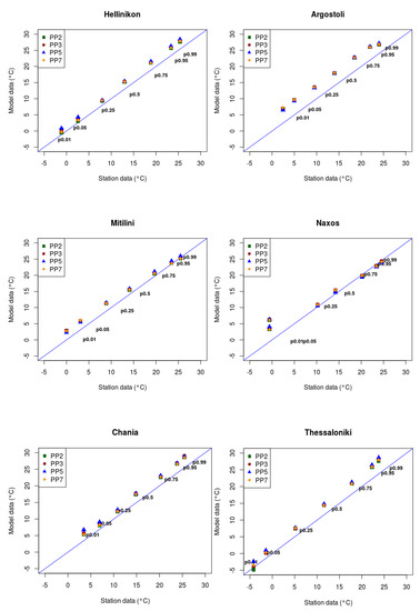 The diagrams for maximum temperature showed a good match between model results and observations at seasonal time scales. The lowest performance was obtained during the summer months, with correlations close to 0.75 that increase to 0.8 for PP5 simulation results. In addition, in the representation of metrics by station in Table 5, high RMSE values are observed, of about 3–3.5 °C for several stations. It was found in the initial study [26] that the cell of the certain model points that correspond to the location of the observed stations is characterized by the sea dominant land use category (e.g., Corfu, Heraklion, Mitilini, Argostoli etc.), and consequently during summer period could affect the results, with higher differences in temperature leading to stronger sea-land interaction in combination with the appearance of more intense thermal instability.
