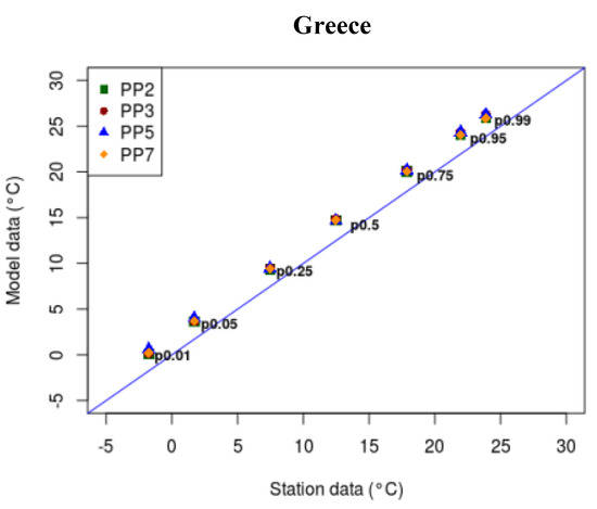 Statistical analysis of the maximum and minimum temperatures for all tested simulations showed satisfactory results, characterized by a good match between modeled and observed data, with high correlation above 0.9, negative bias around 1–1.5 °C, and a positive bias of around 2 °C, respectively. Moreover, good performance was deduced with regards to the examination of extreme percentiles for temperatures and precipitation, with some deviation due to complex topography. PP3 showed a slightly better performance for the maximum temperature in the majority of the stations, while PP2 for the minimum temperature.