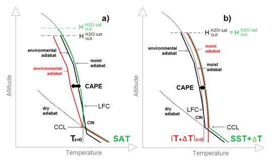 Idealized adiabats (a) over continental regions in mid-summer (in black) and in late summer (in red). (b) above a positive sea surface temperature (SST) anomaly (in red) and above the surrounding ocean (in black) - = surface air temperature, SST= sea surface temperature, is the moist adiabat at altitude z = 0, = SST anomaly (supposing a thermal equilibrium at the interface ocean-atmosphere), CCL = convective condensation level, LFC = level of free convection, = emission level height of outgoing longwave radiation in the saturated absorption bands of water vapor, CIN = convective inhibition, CAPE = convective available potential energy—the path of a rising air parcel is in green.
